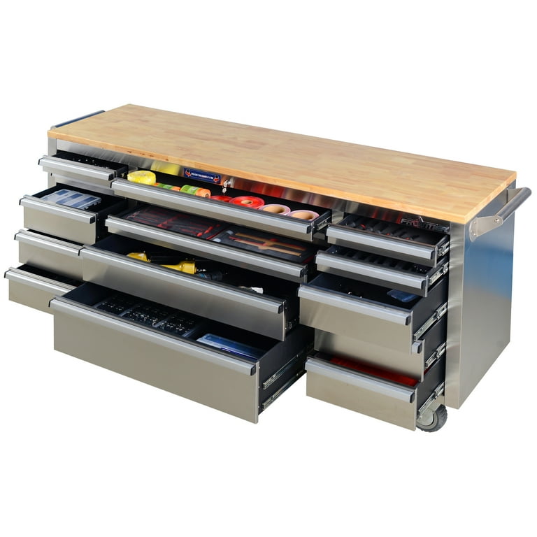 Frontier 72 Inch Stainless Steel Utility Tool Cabinet Organizer With 15 Drawers And 1 25 Inch Thick Wooden Work Surface Walmart Com